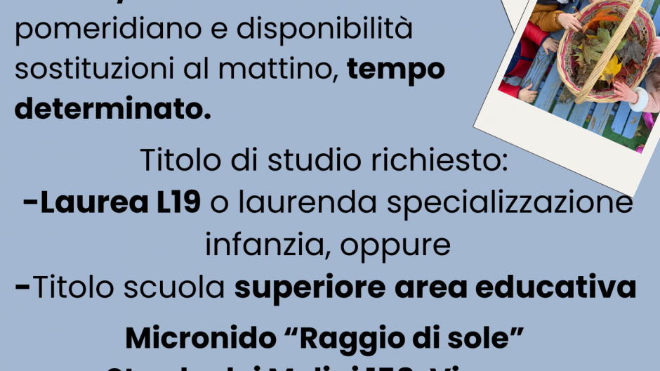 Stiamo cercando una/un educatrice/educatore a 17.5ore/settimanali per il micronido “Raggio di Sole” di Vicenza. Per maggiori informazioni clicca qui per il volantino